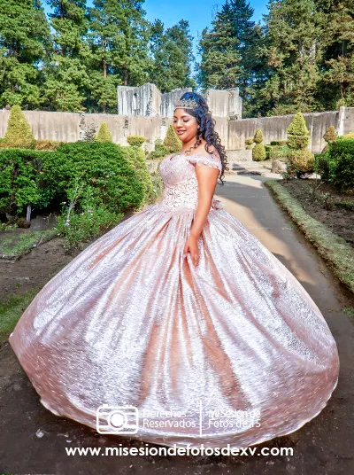 Cada fotografía en este lugar tiene un aire mágico y elegante, donde el contraste entre tu vestido de quinceañera y el verde profundo del bosque genera imágenes que parecen sacadas de una película.